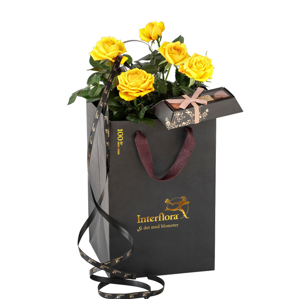 Vår eksklusive gavepose fylt med en vakker gul potterose og vår populære eske fylt med deilige sjokoladebiter av prima kvalitet.